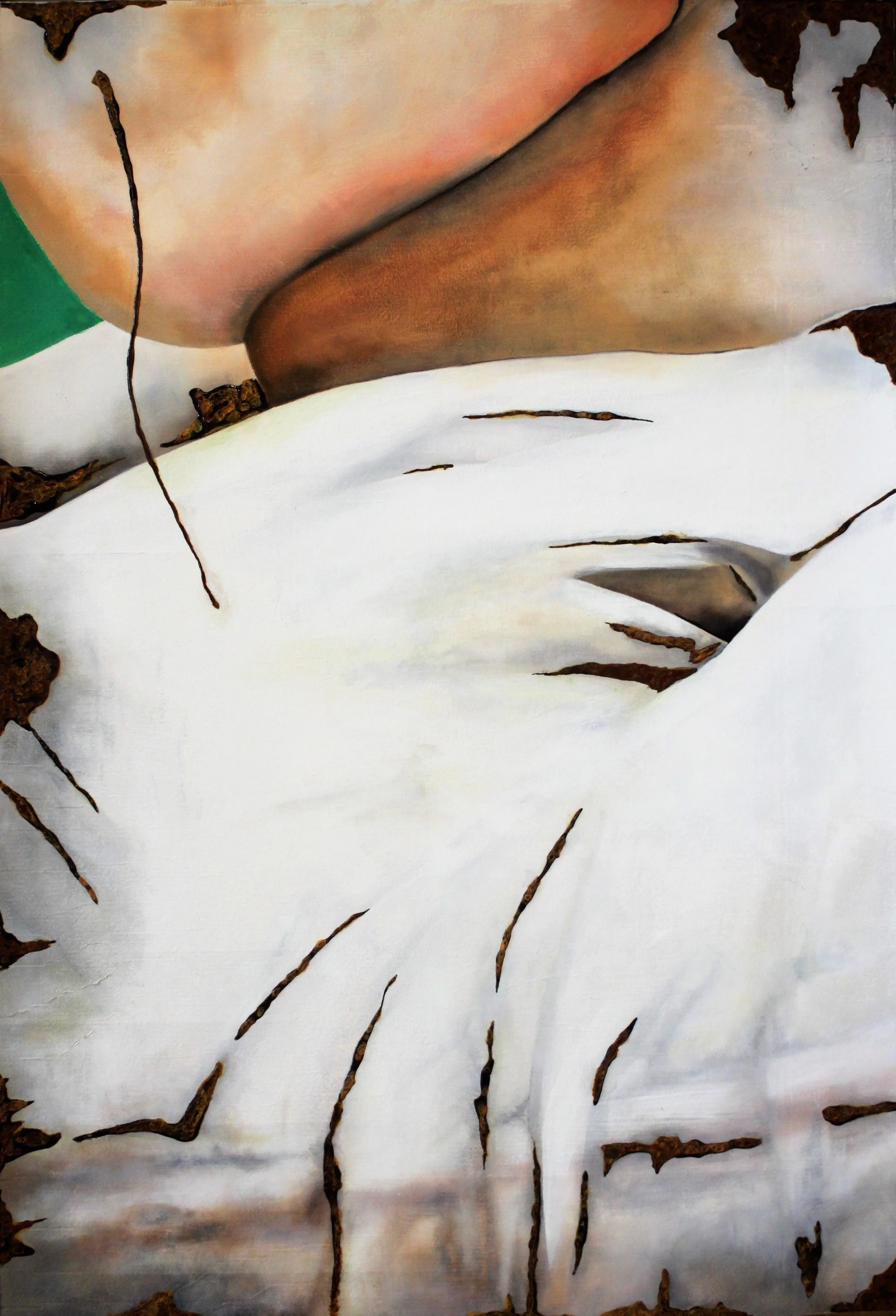 Going beyond current beauty ideals, the women portrayed on the canvas are not just flesh colored identities, they are animated flesh. Skin and flesh are materially inextricably linked. The skin serves as a structurally insurmountable barrier to the invisible and mysterious inner life of the woman. The body is understood as a “landscape” and the skin as the “border” organ that offers protection, giving shape at the same time. To be understood as an important mediator of relationships with the environment in both directions.
